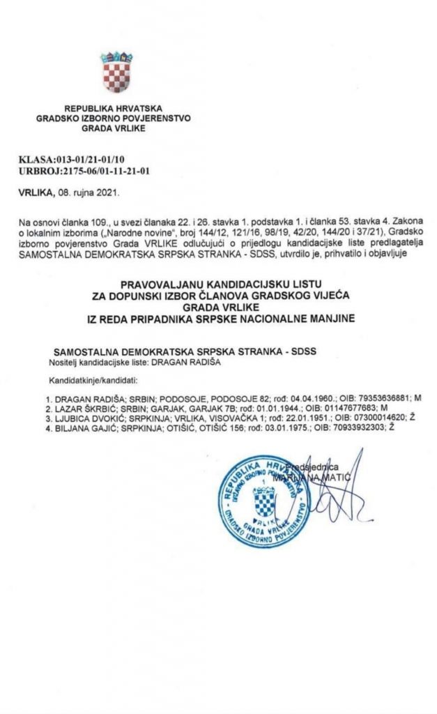 За допунске изборе за једног члана Градског вијећа града Врлике, из реда припадника српске националне мањине утврђена је листа од четири кандидата коју предводи Драган Радиша. Сви предложени представници Срба су са листе Самосталне демократске српске странке, што значи да нема пријављених кандидата из других партија, нити независних кандидата.
