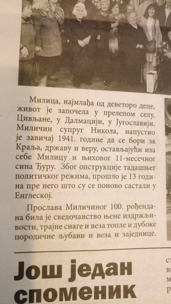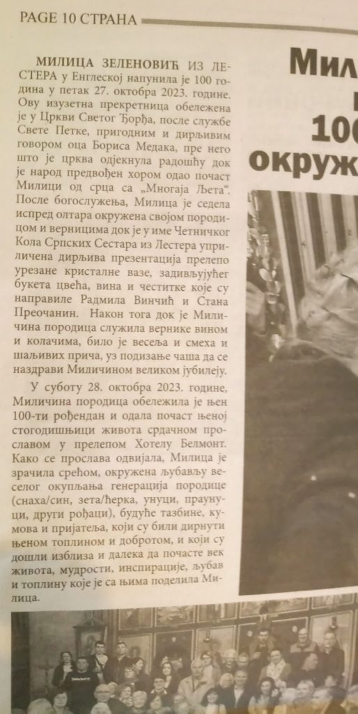 Крајем прошле године -27 октобра 2023 – у Лестеру (Енглеска) стоти рођендан прославила је Милица Зеленовић пореклом из Цивљана. После службе посвећене Св. Петки у храму Св. Ђорђа, рођендан је обележила испред олтара, уз велики број родбине и браће и сестара у Христу. Бираним речима Милици је рођендан честитао старешина храма – отац Борис Медак (више година био је парох у Врлици у цркви Св. Николе), а за остали део обележавања јубилеја постарале су се чланице Четничког кола Српских сестара.