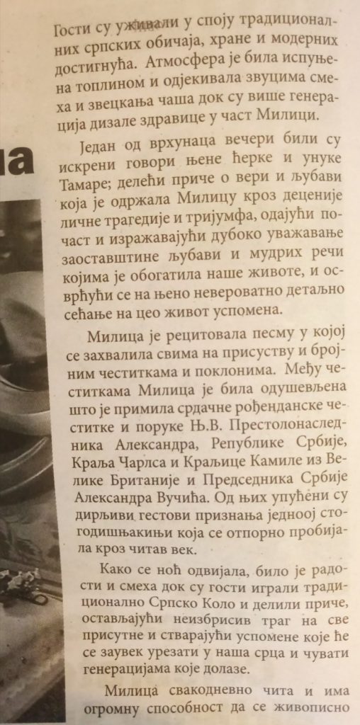 О овом догађају опширан чланак са више пратећих, пригодних фотографија објављен је у Српском четничком листу Србија који се штампа у Канади. Љубазношћу једне од потомкиња Милице Зеленовић (која живи у Београду) дошао сам у посед фотокопије чланка, тако да ће посетиоци сајта  имати прилику да се  упознају са више детаља из занимљиве биографије најстарије Врличанке.